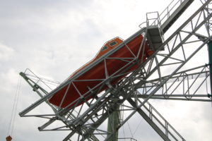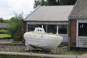 Als wir die Ringvaart van de Haarlemmemeerpolder entlang fuhren, bemerkten wir auf Steuerbord ein eigentümliches Gefährt, das wie ein Unterseeboot aussah. Als wir näher kamen, bemerkten wir eine Fabrik für Seenotrettungsboote. Das weisse ist eine frühe und heute nicht mehr verwendete Version, das orange entspricht den heutigen Standards.