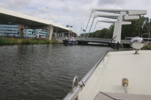 Kurz nach der Bosrandbrug gab es noch eine zweite, die Schipholdraaibrug. Es handelt sich um eine Drehbrücke mit Durchfahrtshöhe 3.40 m. Die beiden vor mir gestarteten Sportboote waren zu hoch und mussten warten, ich überholte sie Backbord und fuhr unten durch. Eigentlich war auf dieser Strecke Einbahnverkehr angesagt. Als ich schon unter der Brücke wegen der Bauarbeiten mit reduzierter Geschwindigkeit fuhr, kamen mir Sportboote mit hoher Geschwindigkeit entgegen. Naja, dann halt.