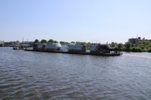 Schliesslich bogen wir in den von Amsterdam an die Nordsee führenden Nordzeekanaal. Diesen befuhren wir bis zur Kilometertavel 10, um dort in den Zijkanaal C einzubiegen. Bei Spaarndam passierten wir eine Klappbrücke vor einer Schleuse, in der bereits einige Sportboote und eine schwimmende Arbeitsplatform wartete. Die Eigenheit dieser Schleuse besteht darin, dass die Brückenöffnung und das Schleusen je Schiff € 3.50 kostet. Zudem kann die Gebühr nur mit PIN bezahlt werden. Ein hilfsbereite Niederländerin bezahlte für unsere beiden Schiffe den Wegzoll, den wir ihr selbstverständlich zurück erstatteten. Hinten gingen die Schleusentore zu, vorne gingen sie auf, ich glaube nicht, dass wir nur einen Zentimeter Hub hinter uns gebracht haben. Dann näherten wir uns Haarlem. Dort besteht eine weitere Besonderheit darin, dass durchfahrende Schiffe eine Gebühr bezahlen müssen. Schiffe, die über Nacht in Haarlem anlegen und Liegegebühren bezahlen, müssen nichts entrichten.