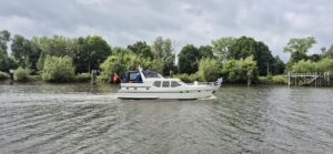 Heute Morgen haben wir um 8:56 Uhr die Taue gelöst und den Hafen Artlenburg bei diesigem Wetter und starken Winden verlassen. Bei den grossen Flächen in Windrichtung schaukeln sich die Wellen auf. Wenn der Fluss mäandert, werden die Wellen sofort bescheidener. Wenn sie gar ablandig aufs Wasser kommen, sind sie zwar immer noch stark, aber harmlos.