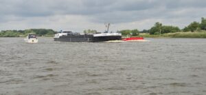 Unterwegs trafen wir die Blaak wieder, die wir schon in der Schleuse bei Bremen vor uns in der Schleusenkammer hatten. Dieses Mal hatte das Schiff einen Leichter auf Backbord-Seite angebunden und deutete mit der blauen Tafel und dem Funkel an, dass wir sie Steuerbord – Steuerbord kreuzen sollen.