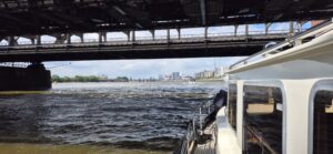Nach der letzten Brücke schlugen uns enorme Wellen entgegen. Etwa die zweite Welle schlug so heftig gegen die Bordwand, dass der Anker eine kleine Delle verursachte. Ich drosselte den Motor bis in den Klick, die beiden anderen Schiffe fuhren in den Cityhafen und machten fest.