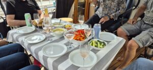 André und Brigitta luden uns auf die Linna zu einem exquisiten Ankerbier ein. Es gab sogar Sekt neben vielen feinen Dips, die unserer Gaumen erfreuten. Wir haben damit eine lange Reise hinter uns gebracht und Schiffe und Mannschaft sicher ans Ziel geführt. In 130 Motorstunden haben wir etwa 1’100 km zurück gelegt.