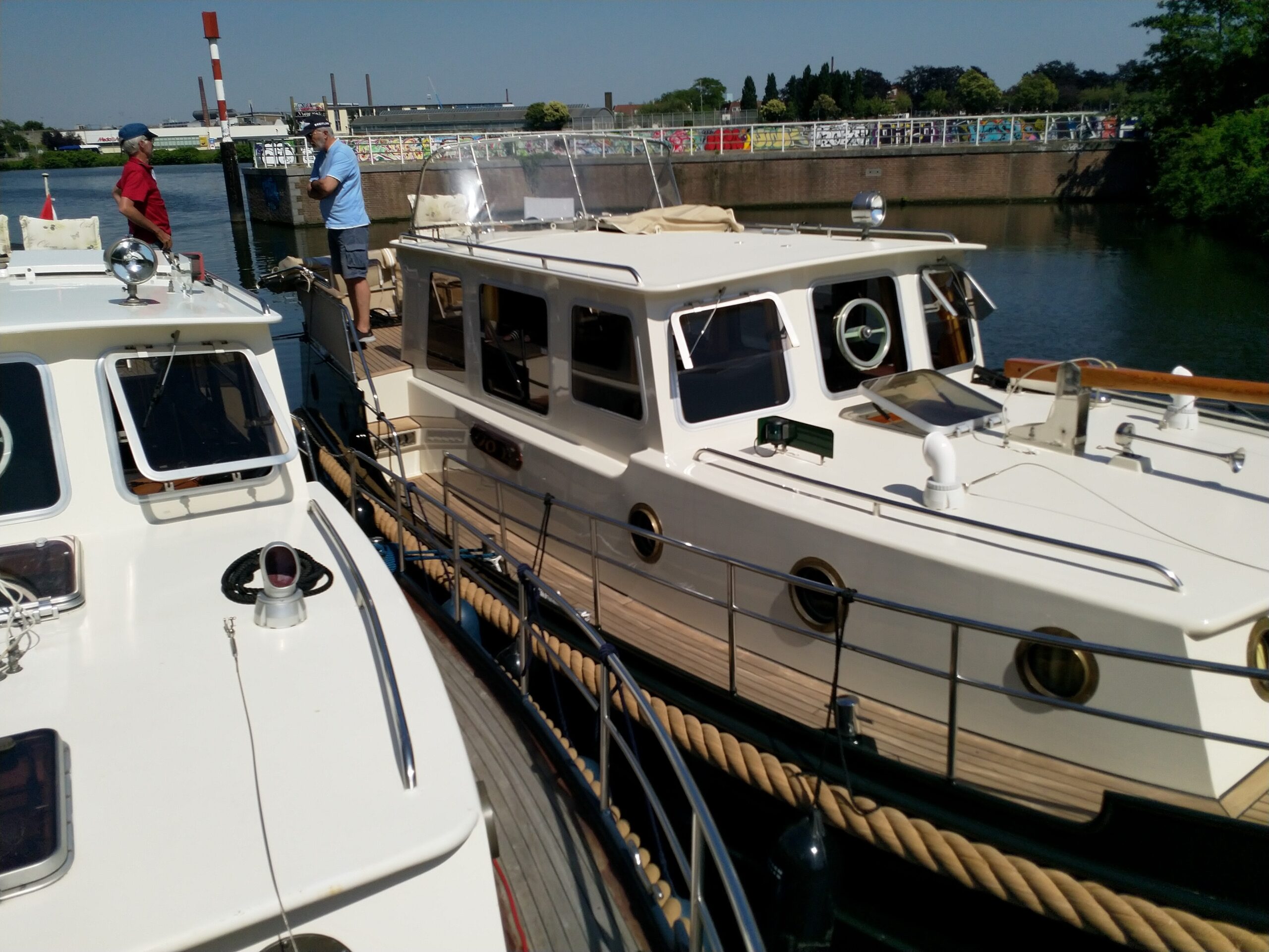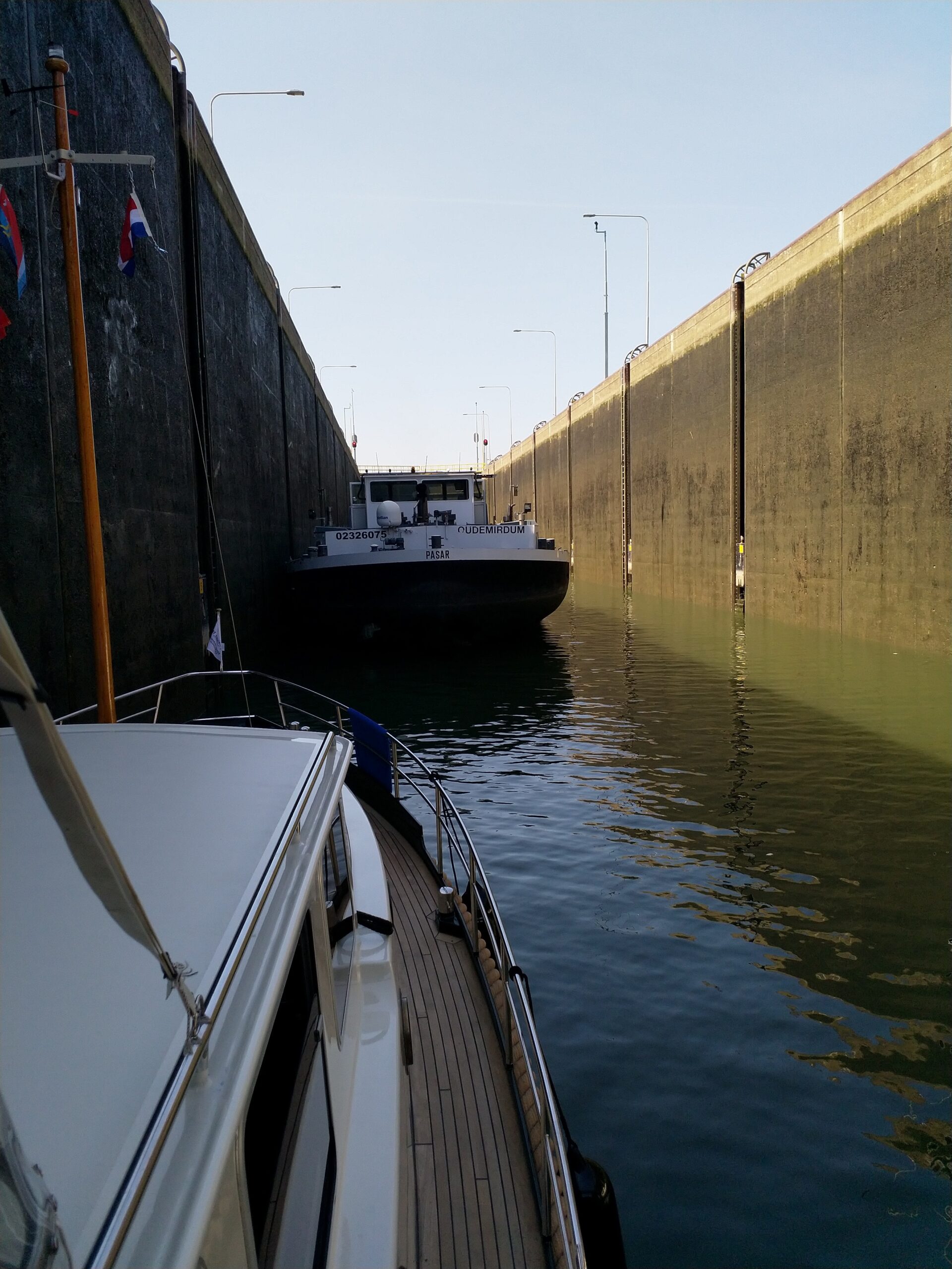 Aber alles der Reihe nach. Bevor das Schleusentor geöffnet wird, ruft man die Hafenmeisterin an. Da es eine Weile dauerte, benutzten wir die Wartezeit für einen kleinen Schwatz über den Gartenhag, ähem, die Reeling natürlich.