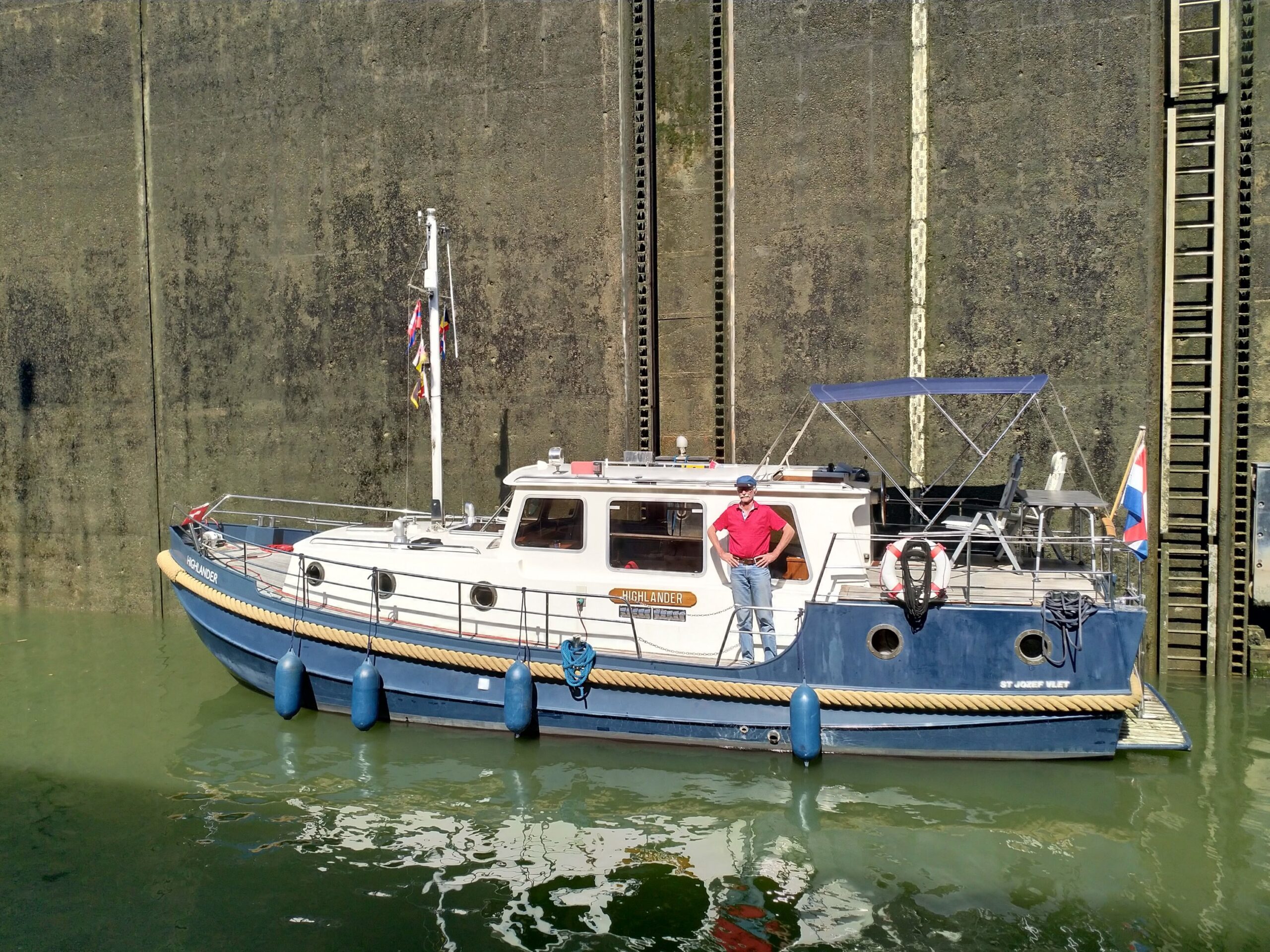 Robert in der gleichen Schleuse. Da er alleine ist, schleust er gezwungenermassen alleine. Bei Schwimmpollern bindet er die Highlander fest an. Hier nach getaner Arbeit: