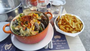 Unsere Taranaki lag gerade neben dem berühmten Muschelrestaurant Chez Bouboule. Es gibt jede Menge Varianten von Moules et Frites. Die Portionen sind reichlich (um 1.2 kg gemäss Menukarte) und sie sind einfach köstlich. Auf dem ersten Bild sieht man die Moules à l’Indienne und auf dem zweiten Moules Mexicaines.