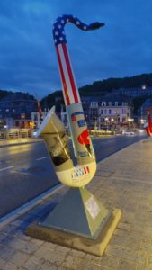Auf der Brücke und überall in der Stadt findet man Saxophone. Sie sind eine Hommage an Adolphe Sax, der aus Dinant stammt und ein Instrumentenbauer war. Er hat das Saxophone erfunden und seinerzeit patentieren lassen.