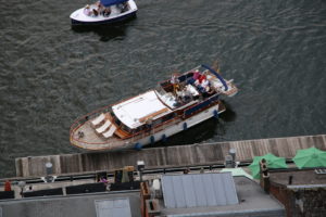 Wir mussten ja bei der Ankunft mit einem Platz ganz am Rand der Anlegemöglichkeiten Vorlieb nehmen, ohne Strom und Zugang zu Toiletten und Duschen. Wir konnten im Verlauf des Tages beim Hafenmeister, der unterwegs die Schiffe kontrollierte, unseren Obulus begleichen und den Zugangscode zu den Toiletten und Duschen in Erfahrung bringen. Wegen des Feuerwerks waren ja grosse Teile der Anlegestege gesperrt, am nächsten Morgen um acht Uhr fuhren wir los, um einen zu ergattern. Das wäre so früh nicht nötig gewesen, da sehr wenig Sportboote unterwegs waren und wir jederzeit noch einen Anlegeplatz gefunden hätten.