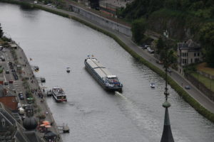 Etwas später sehen wir ihn durch die Stadt fahren. Es ist allerdings das einzige Frachtschiff, das wir auf der Strecke zwischen Namur und Dinant angetroffen haben.
