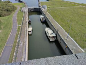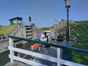 Auf der Rückfahrt machten wir bei der Beneden Sas einen Trinkhalt. Das Restaurant mit Gartenanstoss liegt unmittelbar neben der Schleuse und dem Personen- resp. Fahrradsteg. Im Gegensatz zu üblichen Schleusen und damit verbundenen Brücken ist die Schleuse hier immer offen und die Brücke muss über einen Knopf bestellt werden. Auf Schienen wird sie herangeführt und überspannt dann den Kanal.
