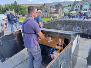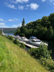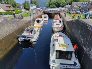 Wie vereinbart um 9:30 Uhr versammelten wir uns vor der Schleuse, um bergwärts zu schleusen. Die Lock Dochgarroch fasst sechs Sportboote. Voraus fuhr ein Schiff mit deutscher Crew, die allerdings nicht so bewandert war. Die Schleuse bietet keine Reserven, so dass man dicht auf dicht aufschliessen muss. Das machen insbesondere die Skipper mit wenig Erfahrung nicht immer richtig. Wir schafften es aber trotzdem.