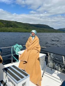 Der See ist ziemlich lang, wir hielten angestrengt nach dem Nessie Ausschau, konnten es aber nirgends entdecken. Der Wind wurde zeitweise ziemlich stark. Wir waren durch unser Verdeck im Windschatten gut geschützt. Das Schiff von Ernst und Ramona, auf dem Susanne und Doris mitfuhren, verfügte nicht über den gleichen Komfort. Was das nach sich zog, zeigt das Foto mit Susanne.