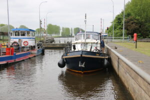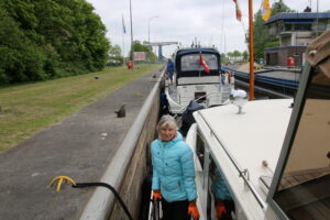 Bei der Gaarkeukensluis hatten wir Glück: Wir konnten gleichzeitig mit zwei Frachtern und einem Bunkerboot (Schiff, von dem in Fahrt Diesel bezogen werden kann) schleusen.
