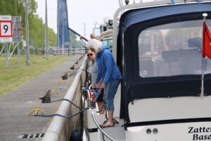 Schliesslich näherten wir uns der Dorkwerdersluis, über die wir Steuerbord den Kanal verliessen. Die Schleuse forderte uns, weil wir bergwärts schleusten und unsere Taue, die rund um den Schiffsrumpf angebracht sind, nicht an den Algen verdrecken wollten. Es hatte in gewissen Abständen Holzbalken mit Gummipuffern. Zwischen diesen Balken gab es Hohlräume bis zur Ziegelsteinmauer und wir versuchten, die Fender so zu positionieren, dass sie auf die Höhe der Balken kamen und damit die Taue entlang unseres Schiffes geschützt sind. War gar nicht so einfach, weil das einfliessende Wasser unsere Taranaki doch ziemlich hin und her tanzen liess.