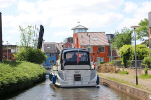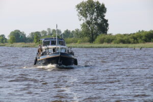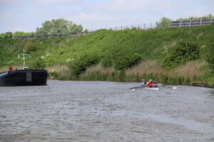 Auf dem kurzen Kanal zum Jachthaven Reitdiep in Groningen passierten wir vorsichtig ein Arbeitsschiff, das den Kanal ausbaggerte. Auf dem Kanal waren auch Ruderboote (4-er) unterwegs, wovon einer freundlicherweise wartete, so dass wir passieren konnten.