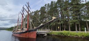 Bereits nach der Schleuse beobachteten wir wieder einen Zweimaster, der allerdings nicht mehr sehr im Schuss zu sein schien. Wir glauben, dass die Segel schon länger nicht mehr verwendet wurden. Die Crew machte auch nicht gerade einen aufgeweckten Eindruck.