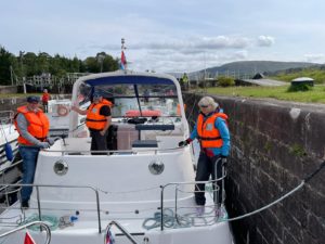 Heute Morgen hatten wir geplant um 9:30 Uhr abzufahren. Der Schleusenwärter der Schleuse Gairlochy wies lautstark darauf hin, wie wir seine Taue am Schiff zu fieren hatten, da gab es keine Kompromisse. Leider verstanden wir seinen starken Akzent nicht auf Anhieb, weshalb uns schliesslich Samuel mit Rückfragen aus der Patsche half. Vorne links hatte ein LeBoat-Skipper angelegt und wir waren eigentlich froh, dass er nicht direkt vor uns lag. Beim Bergwärtsschleusen musste der Schleusenwärter stimmgewaltig eingreifen, um das Schleusenmanöver nicht zu gefährden.