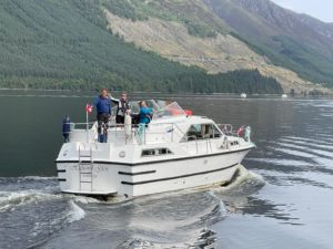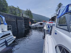 Wir fuhren in unserem Tempo über den Loch Lochy. Ich erhöhte die Geschwindigkeit unseres Schiffes nach und nach auf die 2’400 Touren und erreichte dann kurz nach den übrigen Schiffen den Längssteg vor den Laggan Locks. Ich machte unser Schiff seitwärts am Schiff von Ernst fest und wir warteten, bis der Schleusenwärter die Mittagspause beendet hatte.