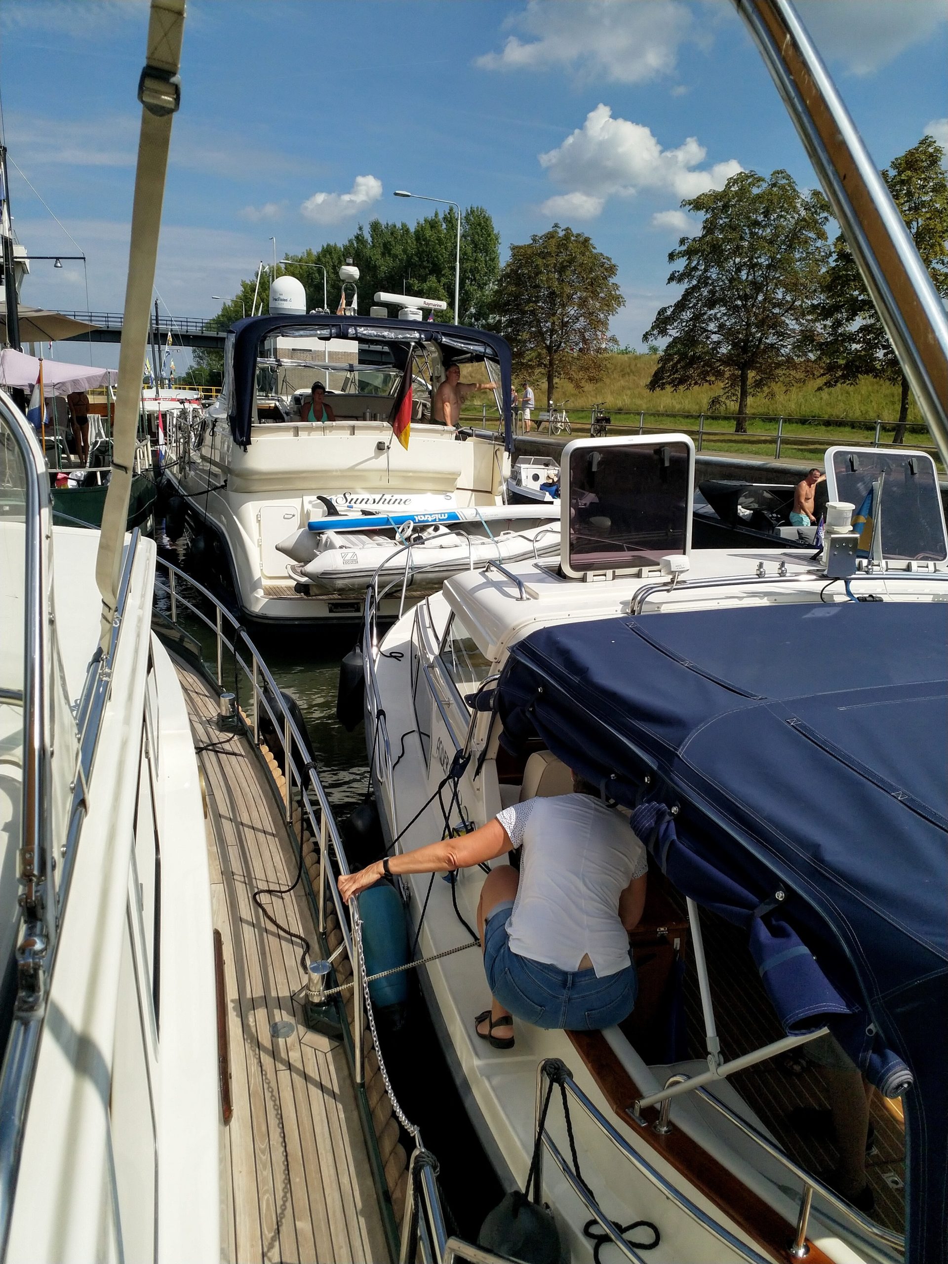 Schiffe dicht an dicht, aufgereiht bis vier Sportboote in einer Reihe. Korrekterweise wird nur die halbe Schleuse benutzt, so wird Wasser gespart.