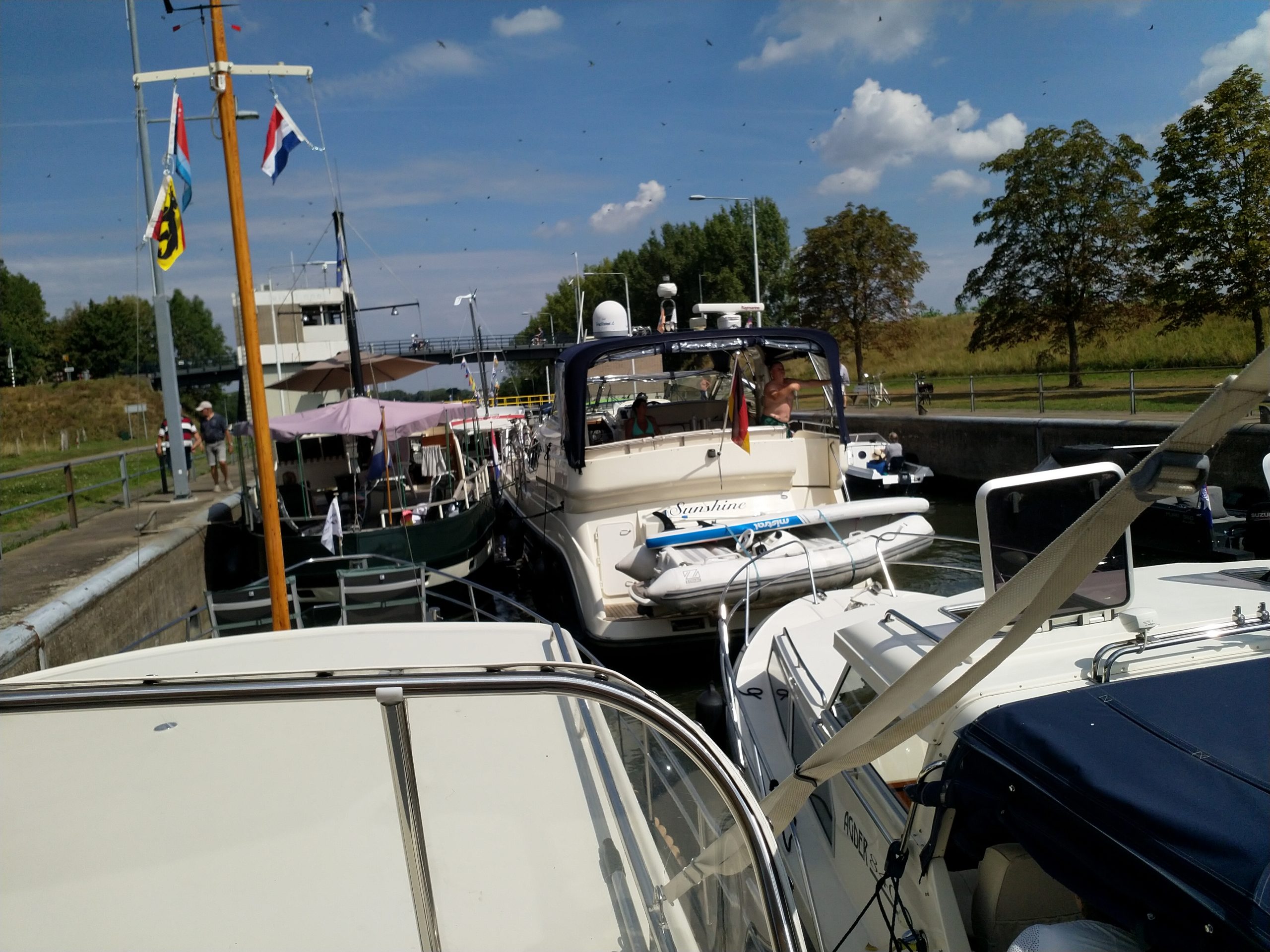 Am Sonntag geht’s los: Nicht allzu früh fahren wir in Wessem ab. Bereit die erste Schleuse Linne talwärts erfordert Geduld. Wir warten dümpelnd vor der Einfahrt. Am Anfang sind wir zwei drei Schiffe, mit der Zeit werden’s immer mehr.