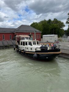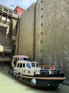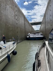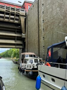 Zwei Frachter verliessen die Kammer, dann konnten unsere zwei Cargos mit Vorrang einfahren. Das hintere Frachtschiff, die Blaak, füllte die ganze Breite der Kammer aus. Der Schleusenverantwortliche wies die beiden Frachtschiffer an, ganz nach vorne zu fahren, damit wir mit unseren Sportbooten auch noch Platz hätten.