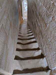 Im ersten Stock – da sind wir wieder beim eingangs geschilderten Gedanken – erreichbar über eine stark ausgetretene Originaltreppe, hat Laila Sahrai kunstvolle Gemälde ausgestellt. Die im Kirchenschiff verwendeten Farben sind immer noch imponierend. Die besonders üppige Verwendung der Farbe Blau fällt auf. Das Ultramarin auf der Basis von Lapislazuli war so teuer wie Gold. Bischof Sigward liess diese Farbe sehr ausgiebig verwenden. Zur damaligen Zeit wurde Lapislazuli ausschliesslich in Afghanistan abgebaut und über die Seidenstrasse bis nach Idensen gebracht.