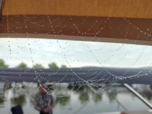 Heute fuhren wir kurz nach sieben Uhr los das Drontermeer hinauf. In der Nacht hatte es geregnet, was beim Spinnengewebe eine schöne Perlenschnur aufreihte.