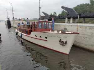 Aufmerksam wurden wir auf die Crew, als uns Kratzgeräusche an der Schleusenmauer auf das schöne Schiff hinwiesen. Wir vermuten, dass dort keine Fender hingen.