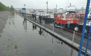 Die fix montierten Randstege dem Damm entlang werden in Kürze überflutet. Die Besitzer der Schiffe sind daran, diese an die Schwimmstege zu verschieben.