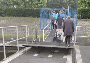 Die Rampe, die normalerweise etwa 50 cm nach unten führt geht auf einmal 40 cm nach oben (Normalwasserstand plus 1 m). Der Hafenmeister erklärte uns, der im Hintergrund liegende Damm werde durch das erwartete Hochwasser überfluten, was dann tatsächlich auch geschah.