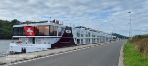 Dann erscheint noch das unter Schweizer Flagge fahrend Flusskreuzfahrtschiff „Excellence Countess“ und wir meinten, noch länger warten zu müssen. Aber kurz darauf fuhren mehrere Buse von Twerenbold vor und tauschte die Gästeschar. Das Kreuzfahrtschiff fuhr dann Richtung Bruxelles talwärts.
