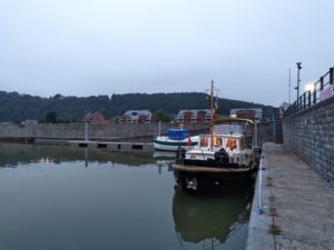 Schliesslich sah ich, dass hinter einem Cargoschiff noch ein Poller frei war. Ich fuhr ein und Brigitte legte das Tau um den Schwimmpoller. Freundlicherweise fixierte der Vordermann sein Cargoschiff Adrie-5 auch am Heck und stellte den Motor ab. So schaukelte es uns definitiv weniger umher, besten Dank auch an dieser Stelle!