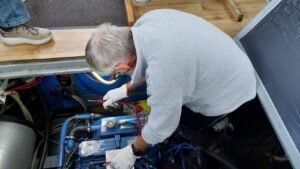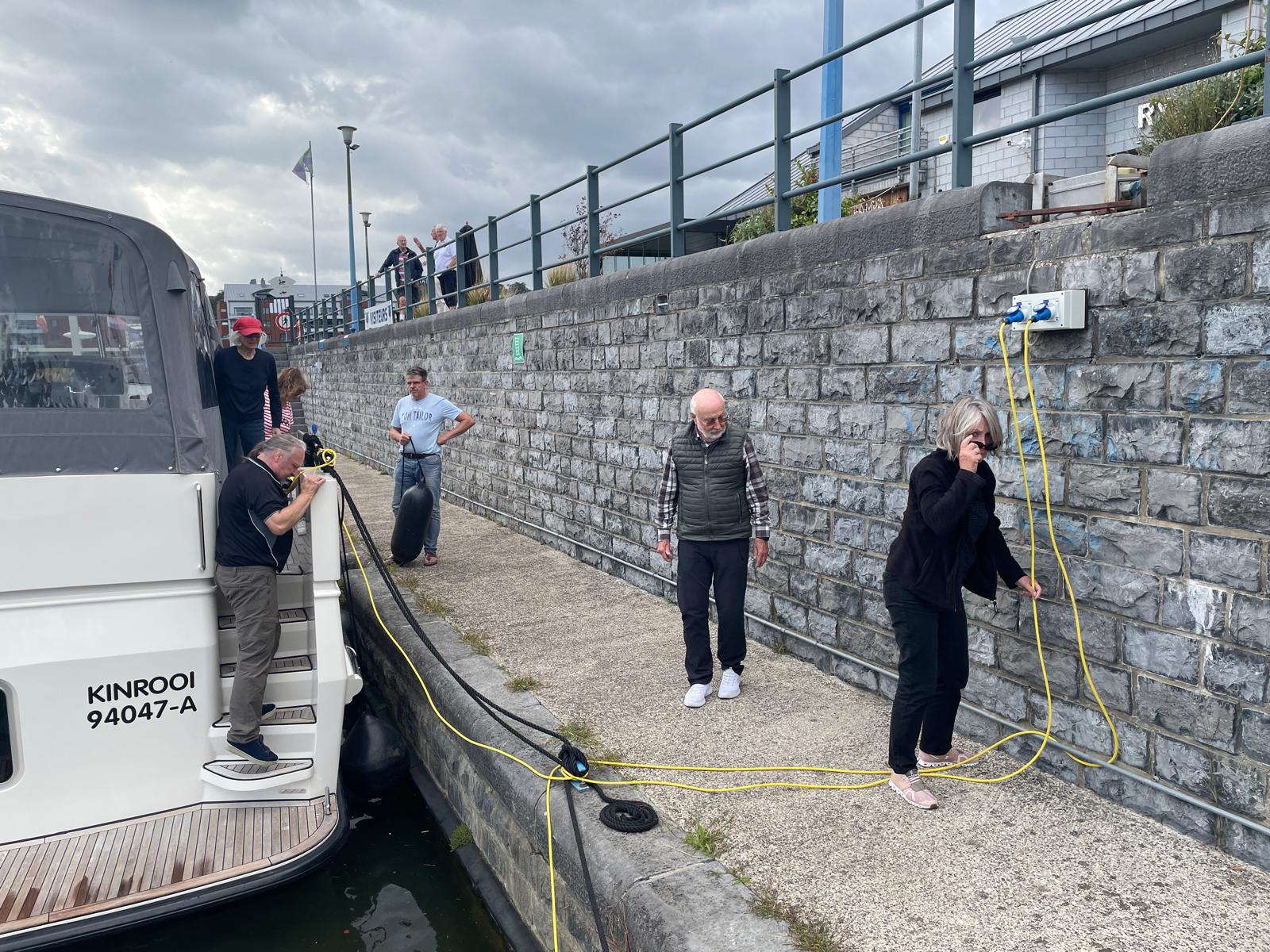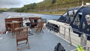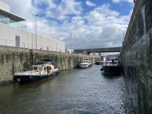 Die Roi de Babar kann den Motor nicht mehr starten. Die Rina Blue hängt den Havaristen an und beide fahren gemeinsam aus der Schleuse. Am Ende des Schleusen Vorhafens wird die Roi de Babar an den Pollern festgemacht. Fünf Schiffe der Gruppe fahren weiter.