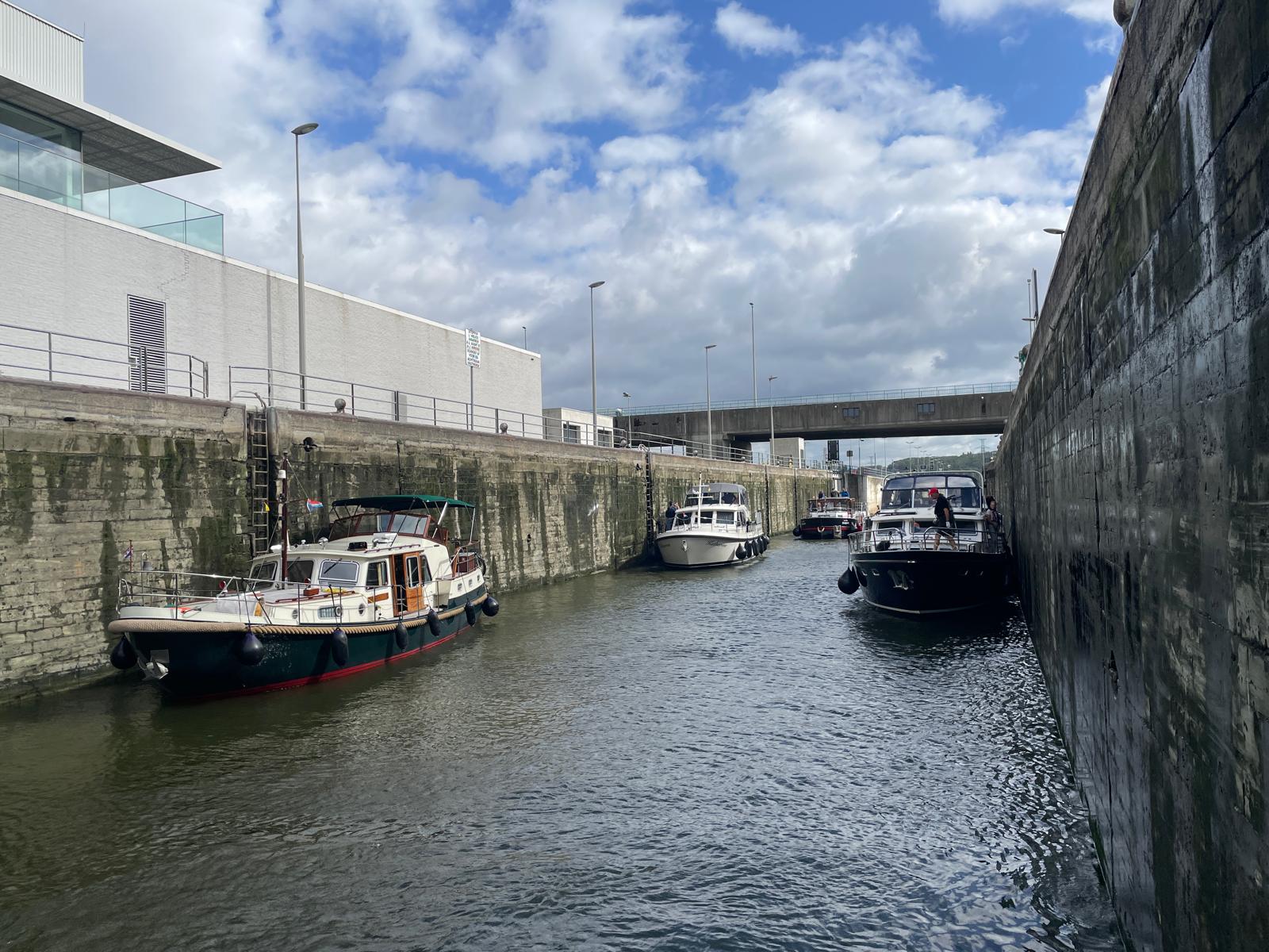 Anfänglich ist der Himmel nur bedeckt, doch nach kurzer Zeit kommt Nieselregen aus den Wolken. Gegen zehn Uhr schafft es auch die Sonne, die Wolken zu vertreiben und strahlt auf die Schiffe. Die Fahrt führt vorbei an zahlreichen Industriebauten. Um 10:35 erreichen wir alle zusammen die «Ecluse d’Andenne-Seiles», mit einer Länge von 200 m und einem Hub von 5.25 m. Zuerst fährt die «Atlas», ein Schubverband ein. Danach alle Schiffe des schleusenverein.ch. Nach etwa einer halben Stunde sind wir oben und die Schiffe fahren aus.
