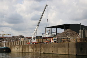 Sie ist ziemlich eng und der Frachtbetrieb doch noch erheblich, was sich an den kreuzenden Frachtern zeigt. Wir fuhren durch die im Hintergrund ersichtliche Bogenbrücke, die uns zwang, den Masten abzulegen, wollten wir ihn und die Taranaki unbeschadet zum Hafen bringen.