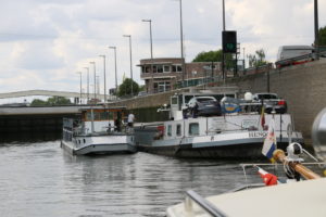 Wir funkten dem Schleusenwärter und der gab an, dass er demnächst schleusen werde. Auch hier kam uns ein Cargo, die unter belgischer Flagge fahrende Henosa zu Hilfe. Wir warteten deren Einfahrt in die Schleuse ab und bemerten ein Wohnschiff, das noch während der Fahrt am Cargo festmachte.