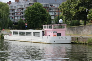 Wir kamen mit dem Belgier ins Gespräch. Er war früher Cargo-Schiffsführer gewesen und hat sich auf die alten Tage den Frachter angeschafft und umgebaut. Der Frachter wurde 1878 gebaut und ist immer noch fahrtüchtig. Die Schiffswände sind genietet, wie das nurmehr bei ganz alten Schiffen zu sehen ist. Das Schiff macht immer noch einen sehr guten Eindruck und wird von ihm und seiner Frau gefahren. Die schönen Blumenarrangements auf dem Schiff seien aber eindeutig im Zuständigkeitsbereich seiner Frau.