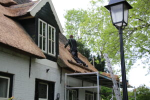Die Häuser sind oft mit Schilfdächern versehen. Sie müssen von Zeit zu Zeit ersetzt werden und wir haben einen entsprechenden Fachmann bei der Arbeit angetroffen.