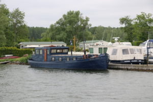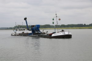 Es gibt aber nicht nur Freizeitschiffer, die die Gewässer befahren. Das Arbeitsschiff hier auf dem Bild vertieft die Fahrrinne, indem es Material vom Grund absaugt und die festen Bestandteile wie Sand und Steine aufnimmt.
