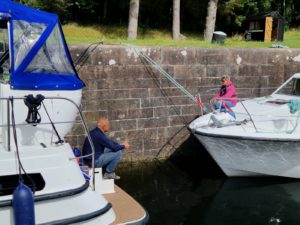 Richtig ernst wurde es dann beim Abwärtsschleusen: Plötzlich hing das Heck des Bootes an der Schleusenwand. Der Skipper hatte himself sein Schiff am Heckpoller fest verankert. Wir riefen dem Schleusenwärter zu, den Schleusenvorgang zu stoppen und wiesen den Skipper an, das Tau zu kappen. Dieser musste noch nach einem Messer suchen und als er das Tau kappte, fiel das Schiff etwa 40 bis 50 cm zurück aufs Wasser. Das Heck trieb dann gegen unser Schiff, wir konnten das aber problemlos abbremsen. Der Skipper von LeBoat entschuldigte sich und wir konnten ihm erklären, dass er beim Schleusen immer fieren müsse das Schiff niemals fixieren dürfe.