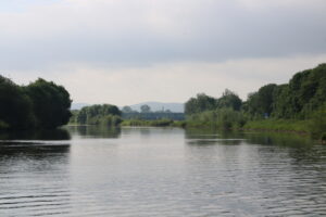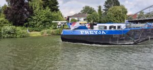 Der Mittelland-Kanal wird von vielen Frachtschiffen als Ost-West-Verbindung (oder umgekehrt) benutzt. Einige Schiffe sind schneller unterwegs, als wir, andere langsamer. Wir konnten einen schwer beladenes Schiff überholen, nachdem Peter Morgenthaler einem überholenden Cargo den Vorrang anbot. So geht das unter rücksichtsvollen Kapitänen. Zum Überholen mussten wir dann schon auf die Tube drücken, kam uns doch schon kurz nachher ein Frachtschiff entgegen. Für zwei kreuzende Frachter und zusätzliche Sportboote ist der Kanal dann doch zu eng. Und wieviel Wasser bewegt wird, lässt sich am Schnappschuss mit der Freya erahnen.