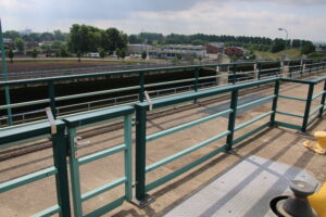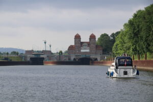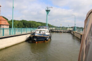 Vor der Schleuse, die zum Mittelland-Kanal hinauf führt, konnten wir noch das imposante Äquadukt bewundern, die den Mittelland-Kanal über die Weser führt.