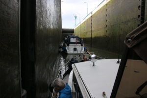 Dann konnten wir auch in die imposante Schleusenkammer einfahren. Auf der Backbord-Seite hatte es Schwimm-Poller, zudem wird die Schleusenkammer von unten her gefüllt, was das Schleusen sehr angenehm gestaltet.