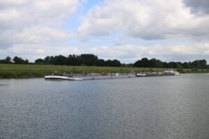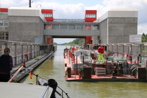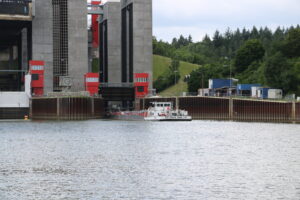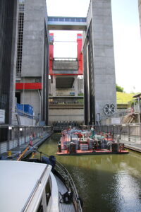 Nach etwa einer Stunde fuhr zuerst der Frachter herunter, wartete an der Steuerbordseite in seiner Fahrtrichtung, bis der Schuber den Leichter einfuhr. Bevor der fertig platziert war, näherte ich mich in Absprache mit dem Hebewerk der Einfahrt in die Wanne, damit möglichst wenig Zeit verloren ging. Zeit ist für die Frachter Geld und ich wollte diesbezüglich kein Hindernis sein.