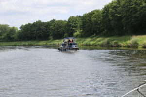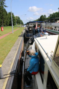 Bei der Fahrt durch schöne Gegenden beobachteten wir einige Greifvögel und einen Feldhasen. Auch die Schleuse Witzweeze konnten wir in der gleichen Formation bergwärts befahren. Der Schleusenwart beorderte uns an die Backbordseite und half dem Segler beim Legen des Taus.