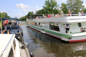 Das war auch heute der Fall: Beim Anlegesteg (auch eine Vorschrift, an die sich jedoch nicht alle halten), erfuhren wir, dass ein Passagierschiff einfahren werde, das jedoch verspätet sei. Bald kreuzte es auf und wir konnten alle (insgesamt 4 Sportboote) mit dem Passagierschiff Lüneburger Heide in die Schleusenkammer einfahren.