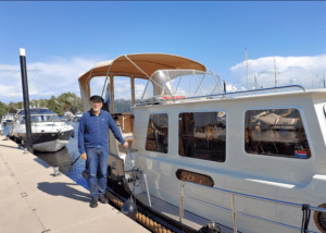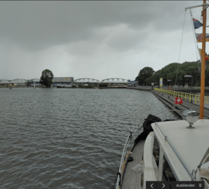 Vor der Schleuse Sambeek sieht es zuerst nach wenig Verkehr aus. Wir meldeten uns über die Gegensprechanlage an (wir verfügen noch über keinen Funk) und fahren in die Schleuse, legen ziemlich weit vorne an. Hinter uns mit gehörigem Abstand folgte das nächste Schiff. Der Schleusenverantwortliche meldete sich über Lautsprecher und bat aufzuschliessen, da einige weitere Boote im gleichen Schleusenvorgang mitgenommen werden sollten. Ich startete erneut den Motor und wir legten die Leine über den vordersten Poller. Beim Abwärtsschleusen merkten wir dann, dass darunter keine weiteren Poller mehr vorhanden waren. Mit der Hubhöhe von 3.9 m würde unsere Leine nicht reichen, weshalb ich den Motor wieder startete, um das Schiff trotz fehlender Leine zu stabilisieren. Die Leine war zu kurz, aber ich konnte die Joy stabil halten.