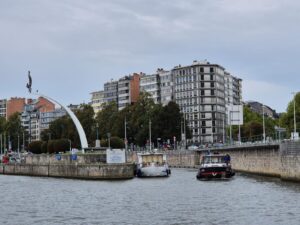 Die anderen Schiffe fahren zusammen weiter auf dem Albertkanal in Richtung Maastricht. Die Babar legt beim Bunkerschiff an und bekommt den nötigen Treibstoff. Danach wird auch der Dieseltank der Rina Blue noch gefüllt. Das Wetter ist auch heute, wie in den letzten Tagen sehr kühl, bedeckter Himmel aber zum Glück trocken. Nach ca. einer Stunde erreichen die Nachzügler die Schleuse Lanaye, wo gerade die Erste gruppe, der schleusenverein.ch Schiffe 13.50 Meter weiter unten ausfahren. Beide Schiffe können für die Schleusung die grosse Schleuse, zusammen mit vier Frachtschiffen, netzen.