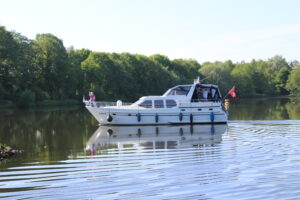 Um 7:56 Uhr verliessen wir den Anlegesteg, wendeten die Schiffe und fuhren hinaus in die Ems. Es war ruhig und auf dem Fluss gab es noch keinen Verkehr. Wir wussten, es würde eine lange Fahrt, planten wir doch 78.7 km zurückzulegen. Am Morgen geht noch alles ruhig von der Hand und deshalb putzte Brigitte noch unsere Deckaufbauten.
