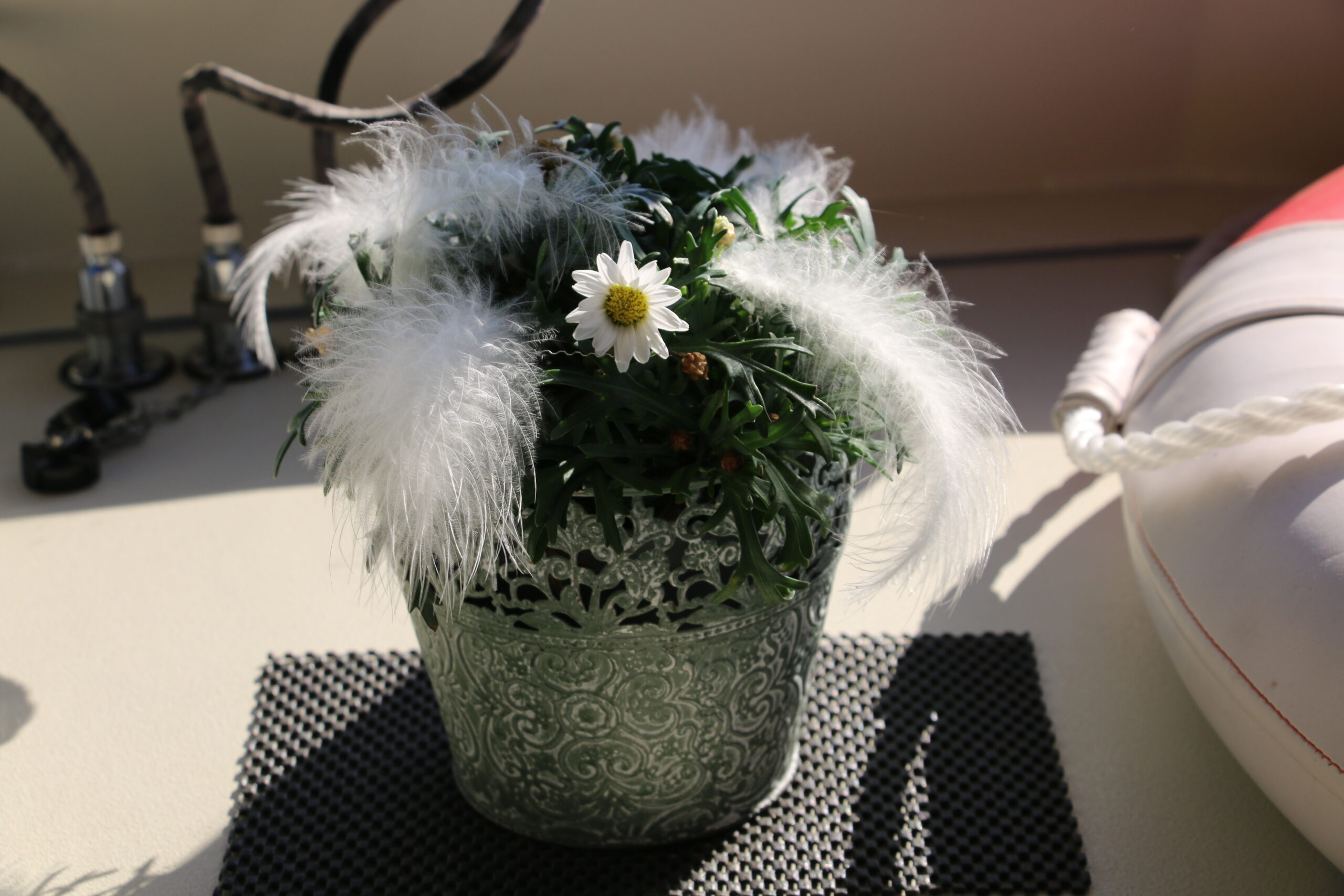 Der Stock Margeriten von Marie-Therese begleitet uns jetzt schon, seit wir auf dem Schiff sind und erfreut sich bester Gesundheit.